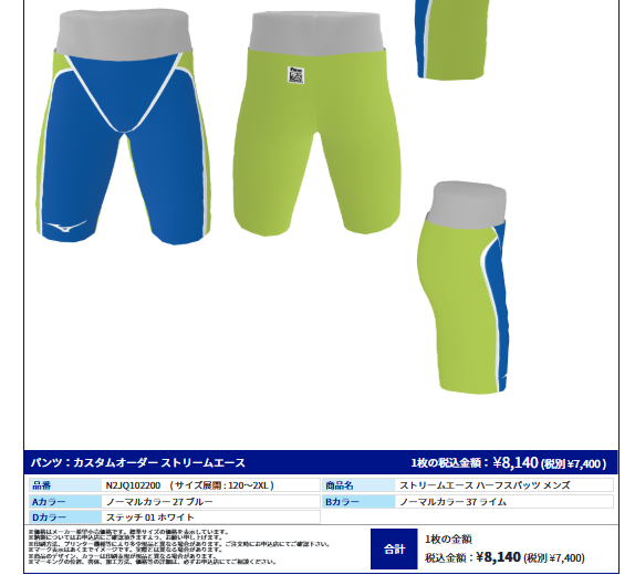 •練習用と大会用水着で、ベース色や指し色の指定が可能なメーカーを調べてましたら、Mizunoが候補の一つになりそうです。